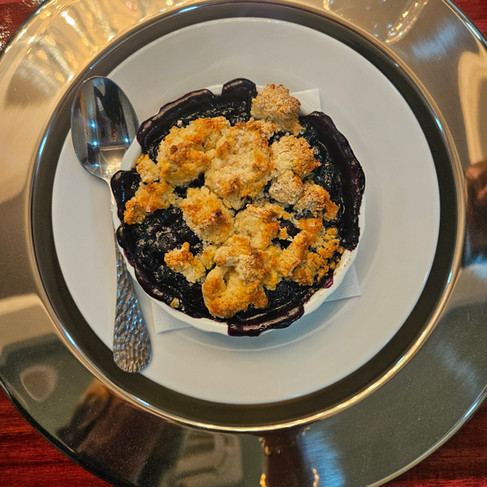 This delightful blueberry cobbler is enhanced by the rich flavors of Rayson Vineyards Blueberry Port. The dessert celebrates plump, juicy blueberries, perfectly balanced with a hint of the port's velvety depth. As the cobbler bakes, your kitchen will be filled with the intoxicating aroma of warm berries and buttery crust. Serve it warm with a scoop of vanilla ice cream. Pair with the velvety, luscious Rayson Blueberry-style port.