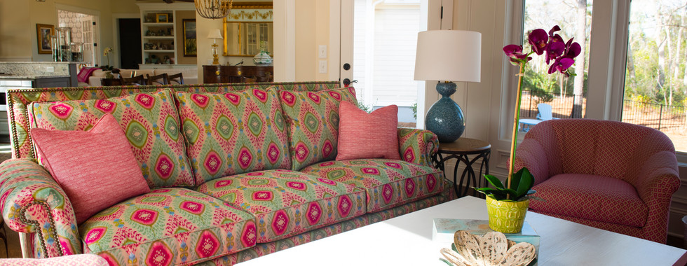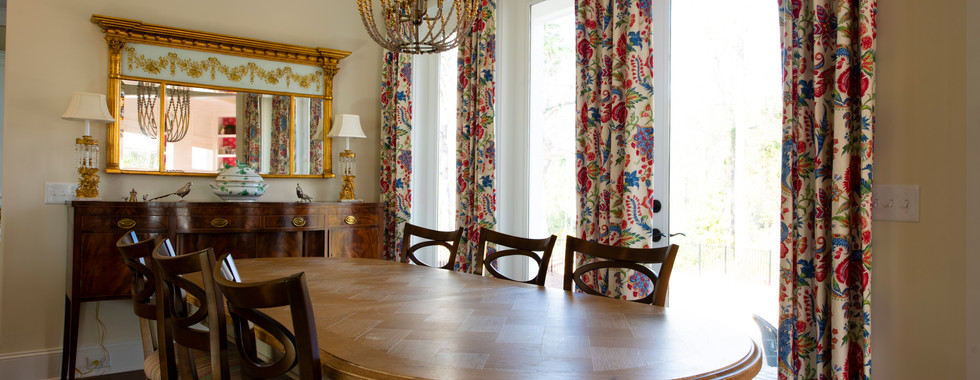 Lisa’s plan to make a home that would fit their relaxed lifestyle and at the same time allow for a nod to the collections, and traditional furniture she inherited from her mother required some professional input. Lisa’s favorite color, Spring Green, was just the touch they needed to make the interior cozy and, at the same time, the living space she was hoping for. The search for the perfect fabrics for the upholstery, drapes, and bedding led them to the combination of largescale patterns used with stripes and small patterns pulled from Robert Allen, Schumacher, Norwalk, Century, etc. CR Laine.